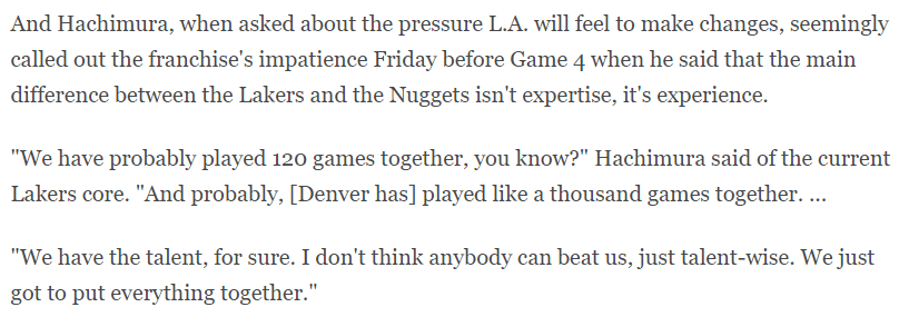 Yet LeBron disagrees with him. The good thing about the team losing in the first round, to the same team and in the same fashion is now they can’t waste another season believing this roster/coach is enough when these non AD/LBJ players are not reliable come playoffs.