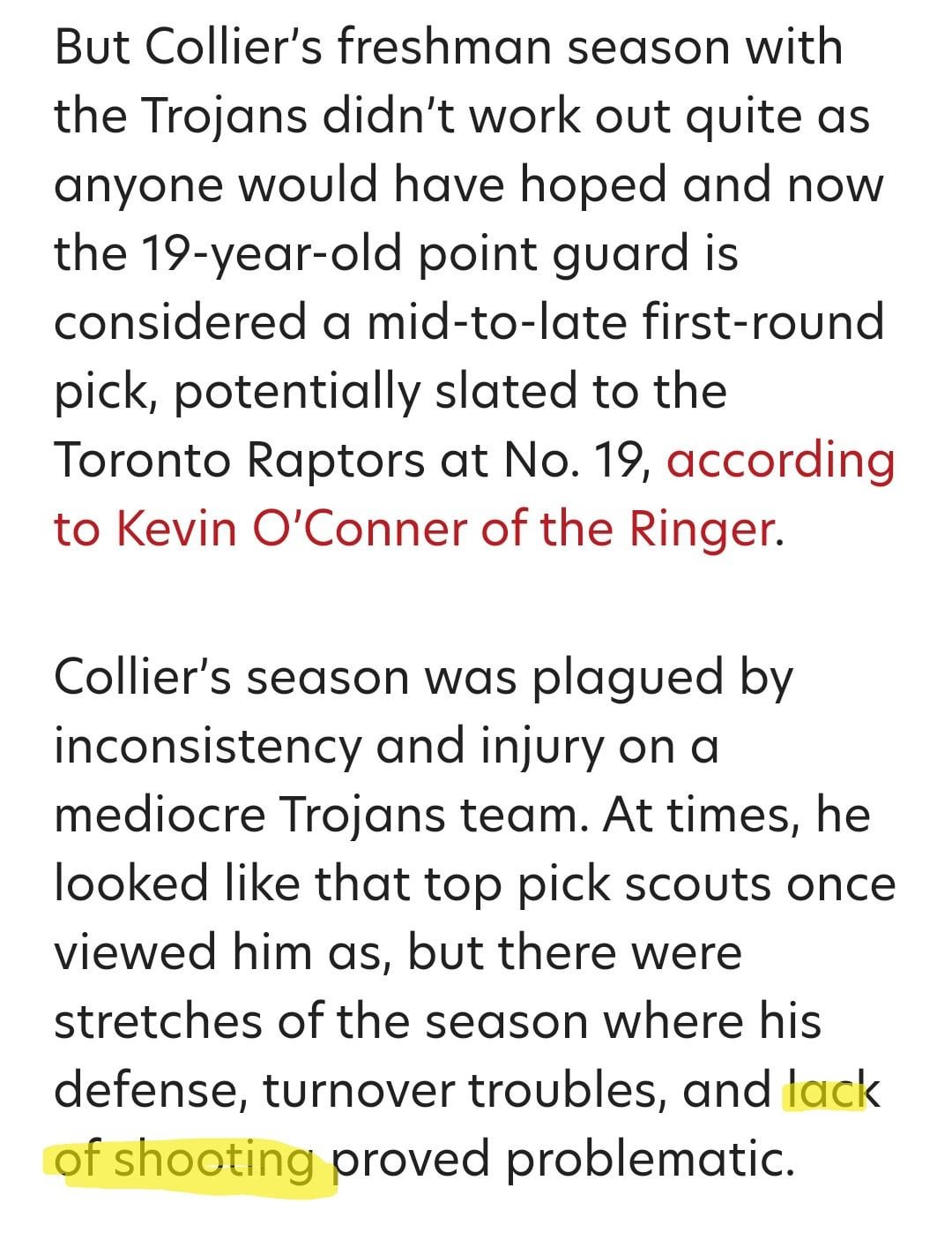 I don’t dislike drafting Collier since he is an effective finisher and he’s probably the only point guard (Note I said PG, there’s a few combo guard this applies to) in the 1st round I would feel good about closing a game with IQ/RJ/SB on the defensive end, at least when it comes to the size that said lineup would have regardless of who the center would be; Isaah is a broad 6’5 PG who’s shown some promise on the defensive end though he’s still got room to improve on that end. The shooting is a bit worrying but as they mention, IC was injured to start and throughout much of the season so I’m willing to give them some benefit of doubt.