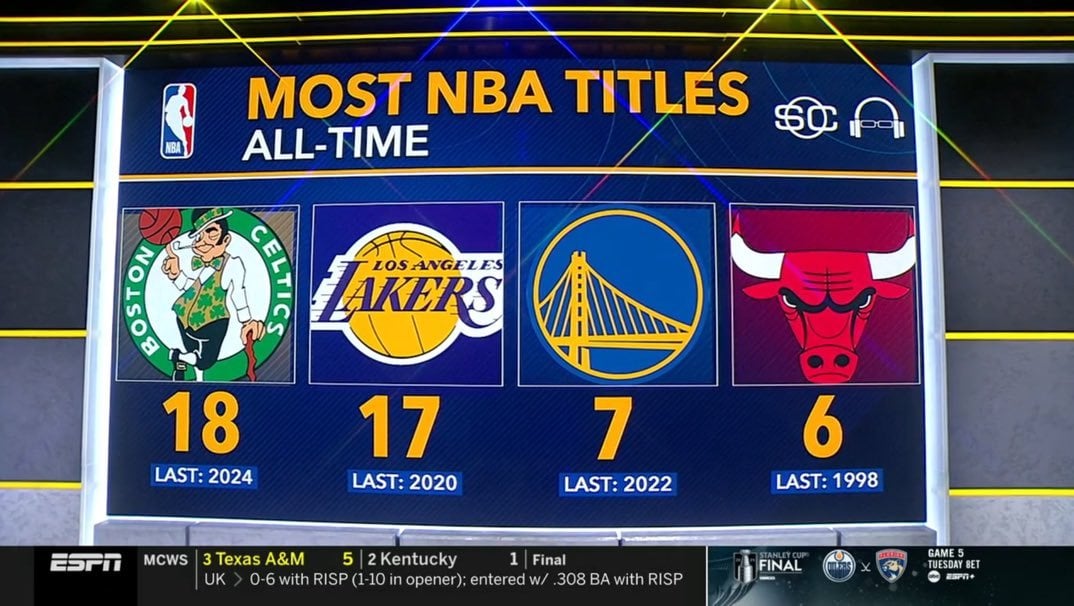 Still gotta pinch myself that the Warriors are actually on this list. 4 of those titles came in the past 9 years to. by spankyourkopita Golden State WarriorsPacific DivisionWestern Conference Prev Post Will the Orlando Magic Sign Klay Thompson this Offseason? June 18, 2024 Next Post Would the Nuggets have beaten the NBA Champion Celtics in the Finals? | DNVR Nuggets Podcast June 18, 2024 1 Comment moulinpoivre 2 years ago Crazy that the bulls only had their first appearance at the finals (and subsequent win) in 1991 and Jordan was able to put that franchise into the all time great category despite leaving in the middle of their run and retiring early.Write A CommentYou must be logged in to post a comment.