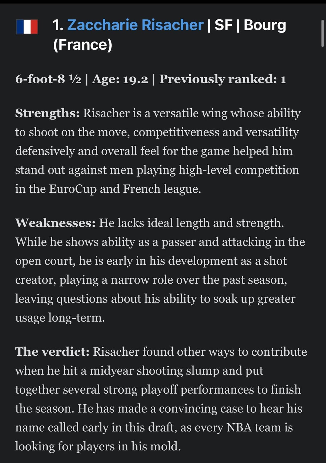 ESPN NBA draft rankings: Jonathan Givony’s top 100 prospects: Risacher, Sarr, Clingan. by Chessh2036 Atlanta HawksEastern ConferenceSoutheast Division Prev Post Will Josh Giddey be our Lisan al-Gaib? June 22, 2024 Next Post Does anyone have a higher quality version of this photo? June 22, 2024 7 Comments Chessh2036 2 years ago TOP 10:1. Zaccharie Risacher2. Alex Sarr3. Donovan Clingan4. Reed Sheppard5. Matas Buzelis6. Stephon Castle7. Dalton Knecht8. Rob Dillingham9. Tidjane Salaun10. Nikola Topic Atl-Fan_FTS 2 years ago Is there any realistic way we could get Clingan AND Zach? MiserableSoft2344 2 years ago Have you read Sam Vecenie’s draft guide yet? justcallmeK 2 years ago I want clingan AnastasiaMoon 2 years ago I feel Sarry for you guys. Sincerely, a wizards fan 💘 SamuraiNeutron 2 years ago Risacher FC STAND UP!! Status-Round3800 2 years ago Sarr is going to be a hawk Somekescreens can’t fool me anymoreWrite A CommentYou must be logged in to post a comment.