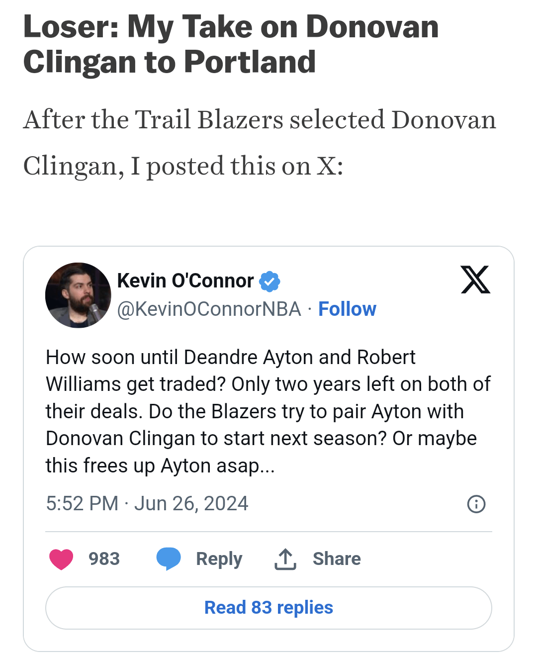 KOC hates everything we do. It’s nothing new. He goes against the grain on every move for us and hated the Dame era blazers. I think it’s personal idk.