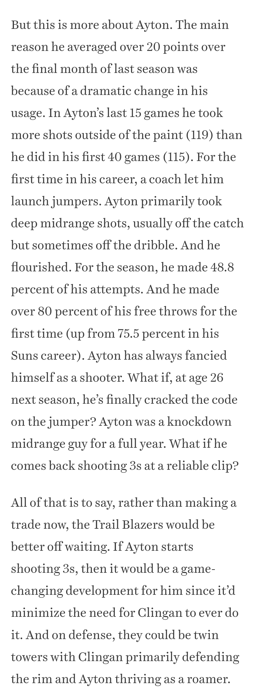 For the last half of the season, Ayton looked like 2011 LaMarcus. Ayton wants to be a 2010s PF, and he flourishes when allowed to be that. It may not work, but we gotta give it a shot.