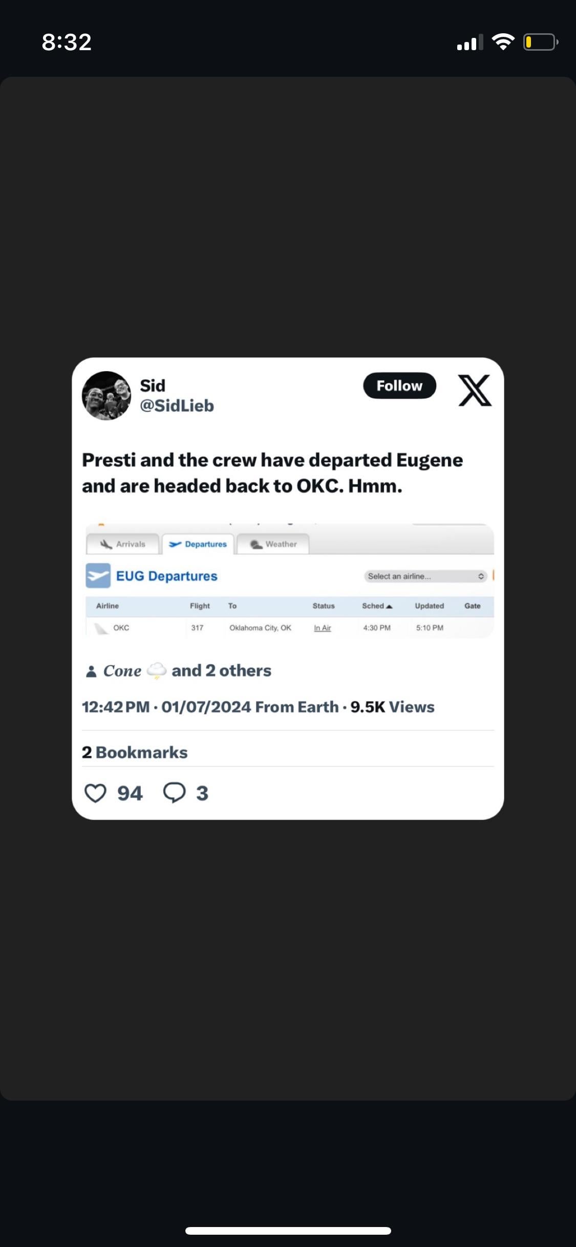 This is killing me. On the one hand this could be them flying down to sign the deal and get him ready to start playing here, or to continue the interview in OKC. On the other hand it could be the end of the meeting.