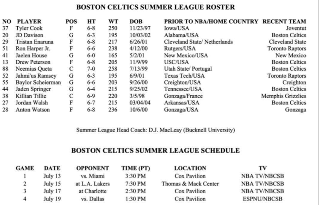 Celtics have announced their summer league roster, featuring, well, a big chunk of their actual roster. Plus Ron Harper Jr, Jahmi’us Ramsey. Killian Tillie, Tristan Enaruna, Jaylen House and Tyler Cook.