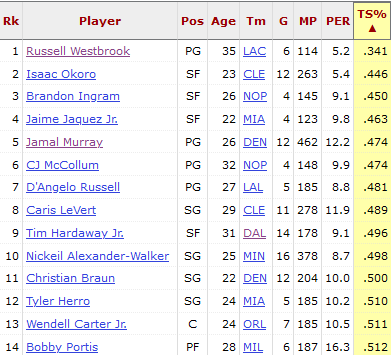 Westbrook had by far the Worst TS % in the NBA playoffs last year. Seems like everyone is ignoring how awful Westbrook was last year in the playoffs.I can see where he could be helpful (ball handling, energy, athleticism) but relying on 36 years old point guard who can't shot seems crazy to me. Especially considering Jamal's injury history.