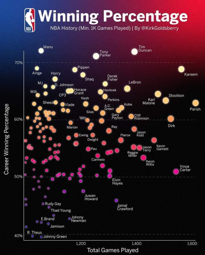 2. Reggie Miller around 50% is a little surprising since I remember the Pacers being a solid team for his career. But I guess that’s selective memory recall for you.