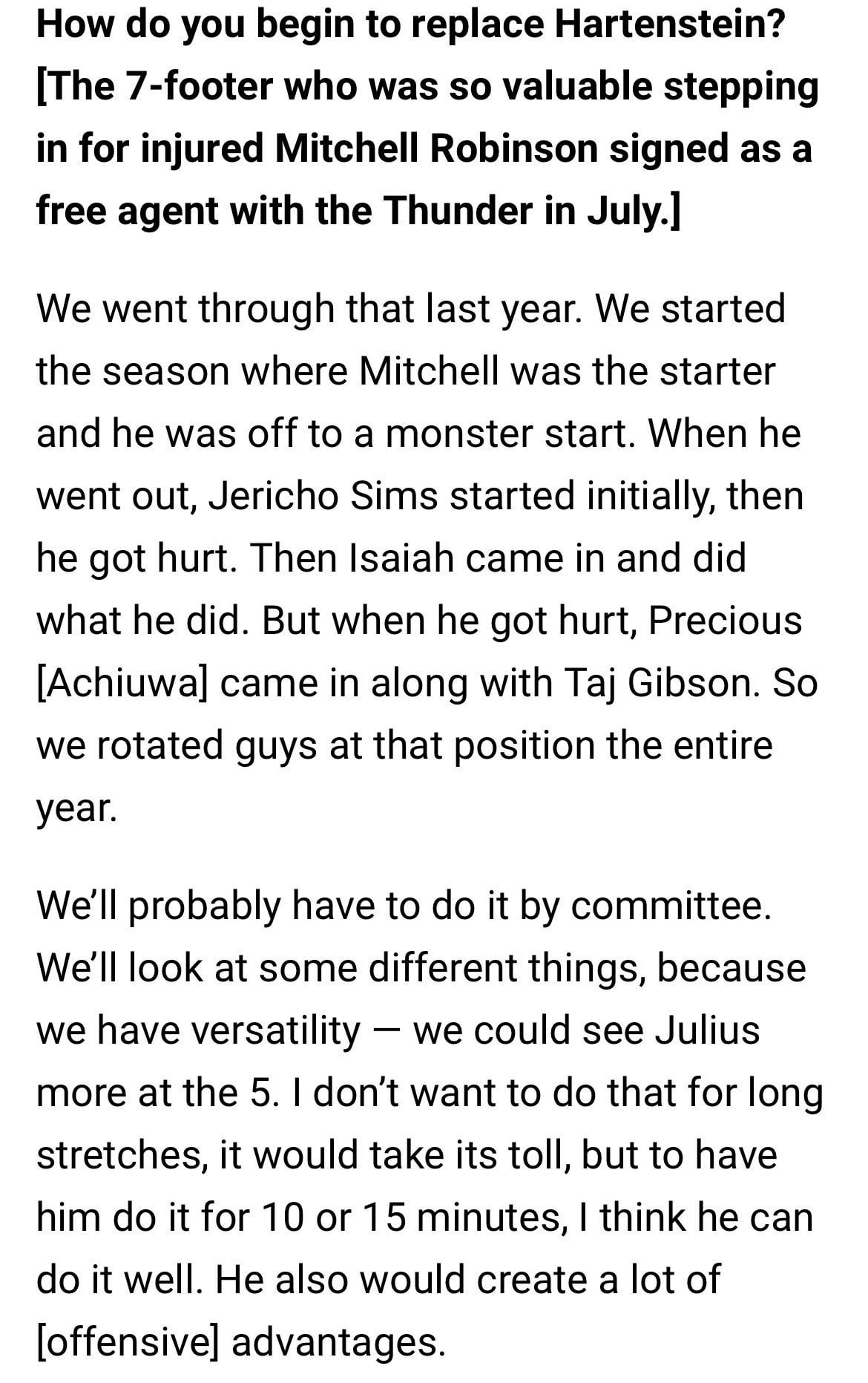 Coach Thibs says that we could see Julius Randle more at the 5 when asked how the team will go about replacing Isaiah Hartenstein