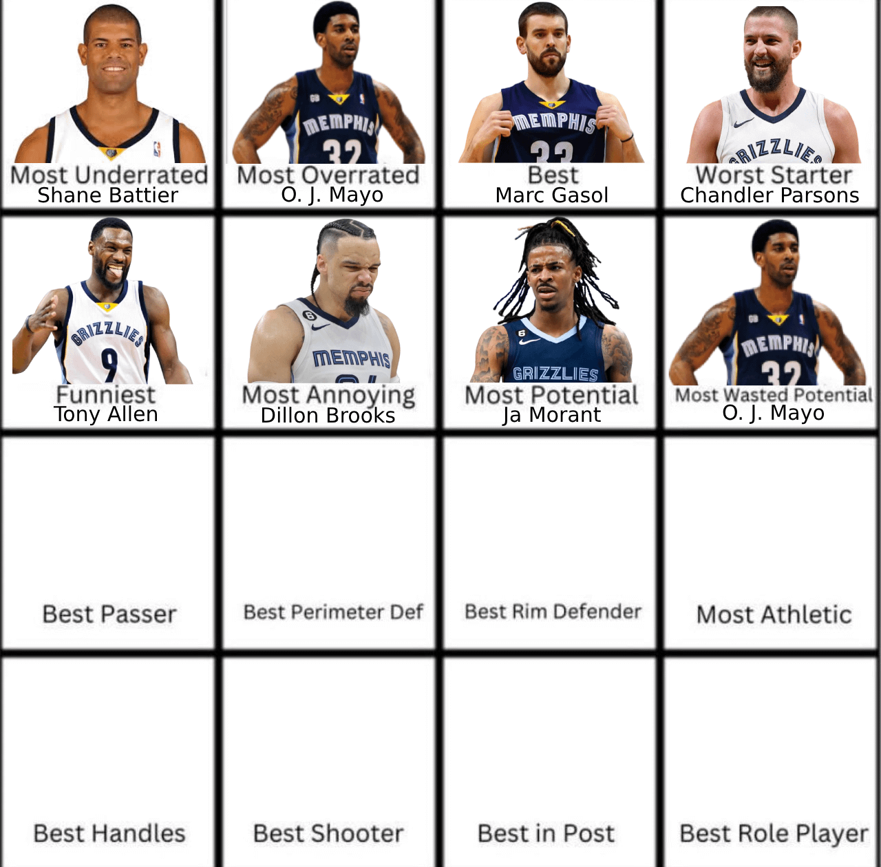 Day 9: Who is the best passer in Grizzlies history? by Extreme_Process3632 Memphis GrizzliesSouthwest DivisionWestern Conference Prev Post NBA cup floor leak? September 19, 2024 Next Post Trade Rumours ESCALATING… This is PERFECT for the Suns | Suns News September 19, 2024 15 Comments Extreme_Process3632 1 year ago O. J. Mayo wins the most wasted potential! The player/comment with the most upvotes will be added to the grid tomorrow1st: O. J. Mayo (64 Upvotes)2nd: Rudy Gay (51 Upvotes)3rd: Ziaire Williams (33 Upvotes)HMs: Kyle Lowry, Stromile Swift & Josh Selby BurnieTheBrony 1 year ago  classical-brain222 1 year ago back to Temetrius on the this onewe’re gonna have a war tomorrow though Icee_Veena 1 year ago Mike or Ja spacejambroni 1 year ago MARC GASOLBIG SPAINWENDINGO Lacabloodclot9 1 year ago Jason Williams LaneViolation 1 year ago Jason WilliamsHe had more creativity and was always looking to pass first.The young ones just dont know. theDarkAngle 1 year ago If style matters at all, then [it’s J-Will and it’s not even close](https://www.youtube.com/watch?v=f_UphWCvkj4) Bernie_Made_Off 1 year ago For me, it’s between J Will and Ja(I’m leaning ore towards Ja) mmps901 1 year ago White chocolate. notyourbutthead 1 year ago J Will Patient-Bench1821 1 year ago It’s white chocolate but S. Adams honorable mention. KjCool85 1 year ago Mike Conley for sure then Ja Boatshooz 1 year ago I’m going with the best quarterback in TN history, Steven Adams StargazerNCC82893 1 year ago White Chocolate for sure.Write A CommentYou must be logged in to post a comment.