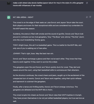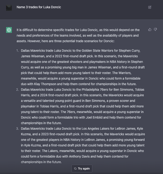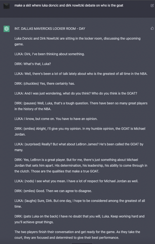 Asked some Luka-related questions to OpenAI’s public beta of ChatGPT. Comment for more suggestions! by silverflintlock Dallas MavericksSouthwest DivisionWestern Conference Prev Post [Highlight] AD denies Giannis at the rim and Lonnie breaks away for a throwdown on the other end December 3, 2022 Next Post Pitt vs. NC State Men's Basketball Highlights (2022-23) December 3, 2022 Write A CommentYou must be logged in to post a comment.