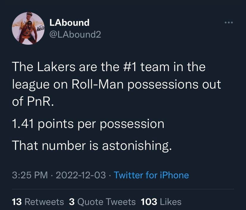 I think we gotta keep using bron AD pNr near the post. That was so effective because bron is closer to the rim and can attack quicker w less steps compared to the high pNr at the top of the key. Obv this shit won’t work in the post season once teams blitz it, but it should be pretty successful in the regular season.