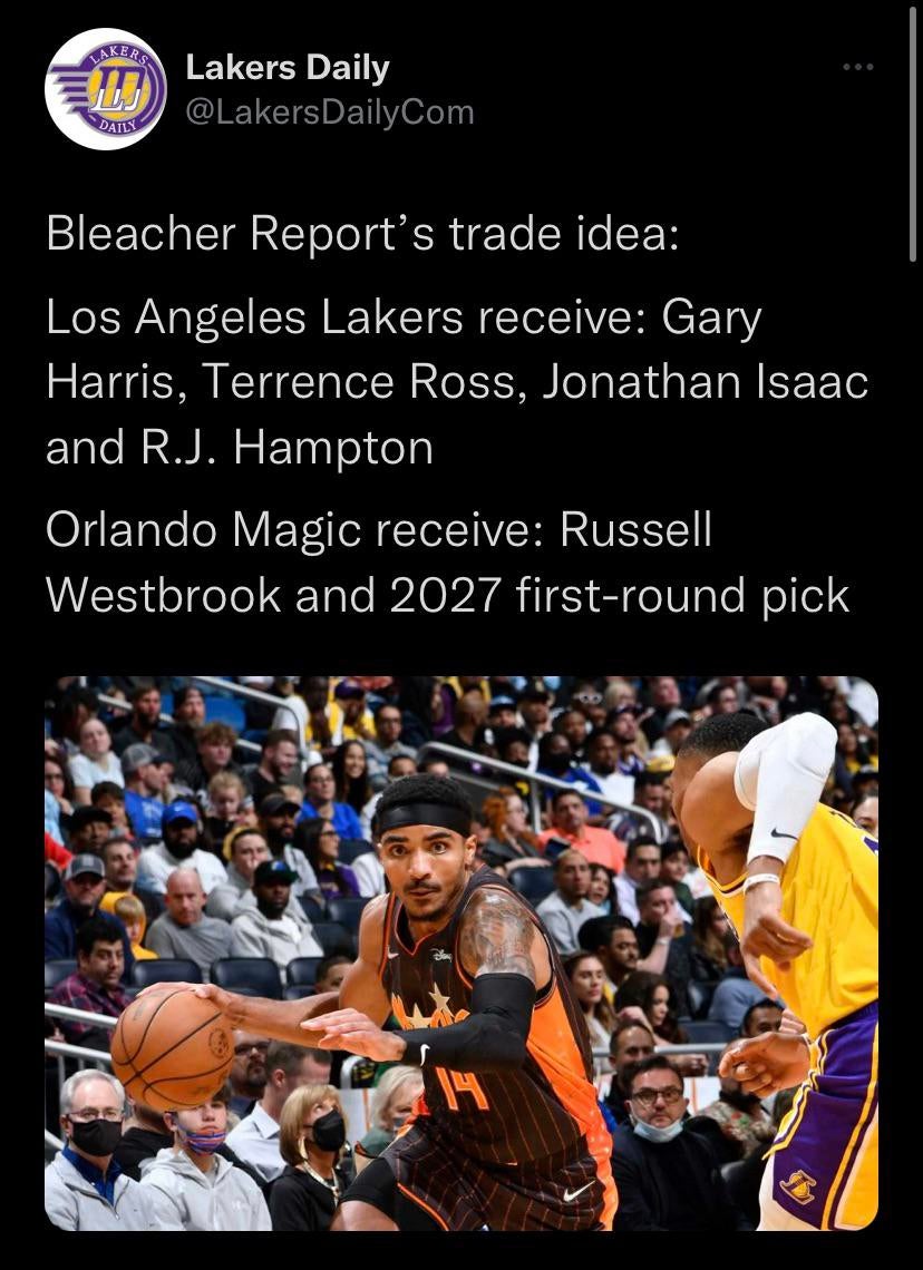 2. Honestlyyyyy… Ross and Hampton are not apart of this future. JI is never playing basketball again. Harris is not some generational role player. Westbrook is on an expiring contract, and that 2027 pick, if unprotected, could be a lottery pick, Lakers are trash. Id be inclined to do this.
