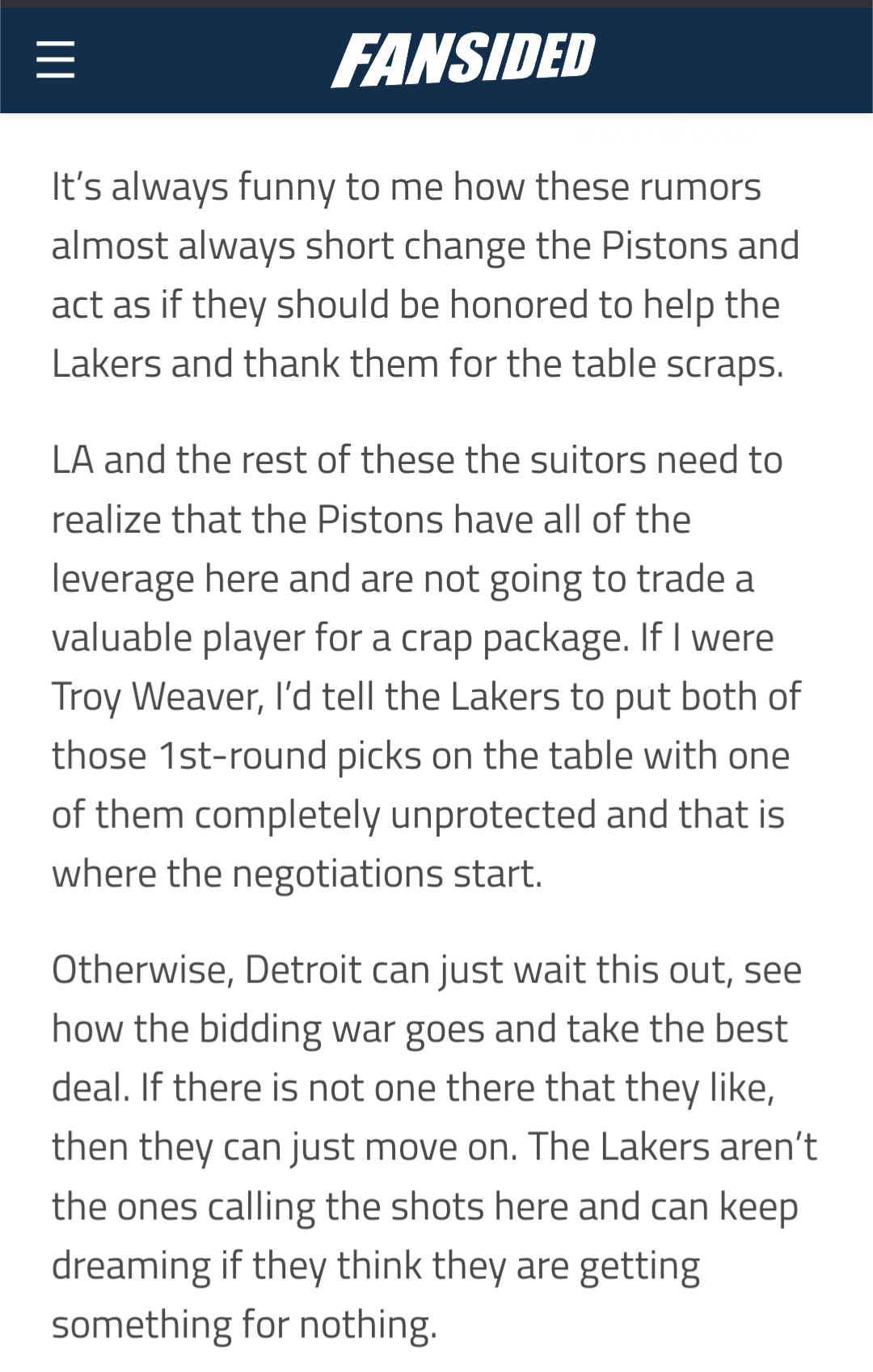 Talks about how the rumors short change the Pistons and then proceeds to short change the Lakers.
