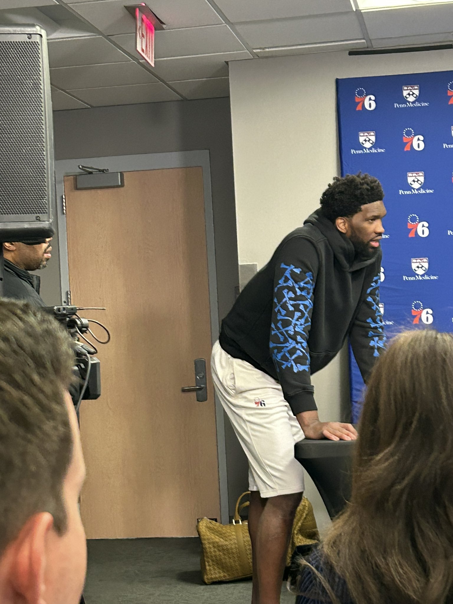 Joel Embiid is standing like this for some reason at the podium instead of sitting in the empty chair right next to him.