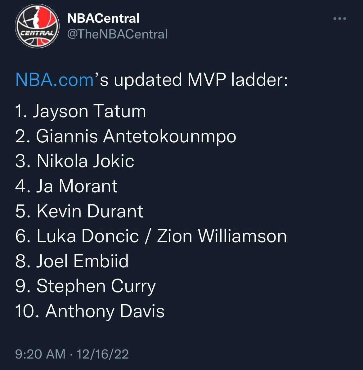 Yeah idk I feel like after the top 5 it’s kinda just a free-for-all. Like you can make a case for Mitchell above any of the 6-10 guys (except for maybe JoJo, though he’s missed a lot of games), and the reverse is also true. Imo most egregious is JoJo at #8 and not having Jokic at #1, and maybe still having Steph on the list at all given we know he’s gonna miss extended time and the Warriors are already below .500.