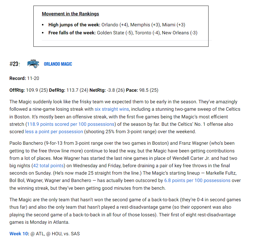 > The Magic’s starting lineup — Markelle Fultz, Bol Bol, Wagner, Wagner and Banchero — has actually been outscored by [6.8 points per 100 possessions over the winning streak, but they’ve been getting good minutes from the bench.