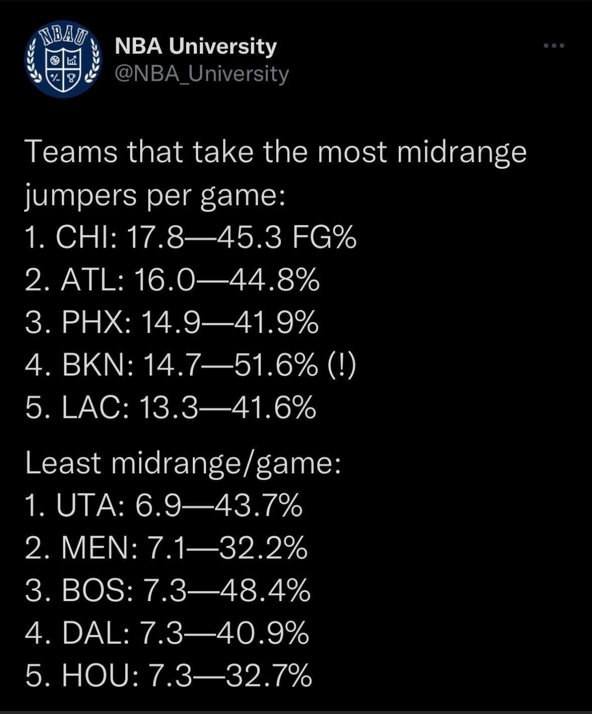 Notice the other top teams and the difference in personnel. They all have elite players taking most of the midranges, we have Hunter, Murray and Collins taking most, compared to KD, CP3/booker and derozan