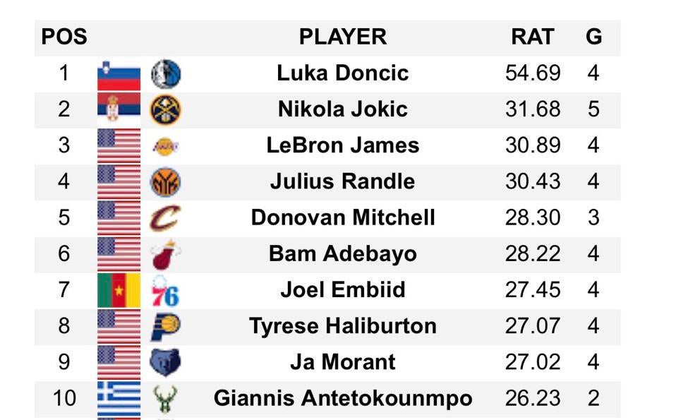 [NBACentral] The 10 best players in the NBA over the last week according to Hoops Hype Global Rating Rankings