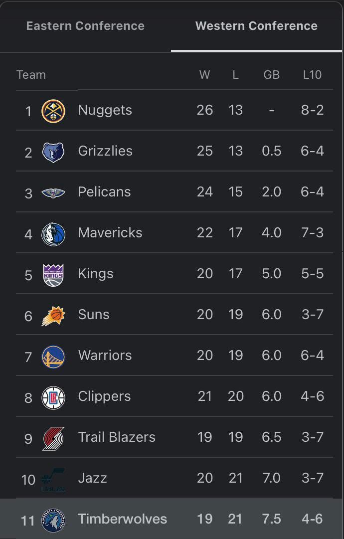Mavs went from 11th with the same record as us to 4th seed after a 6 game win streak. This conference is tight and anything is possible