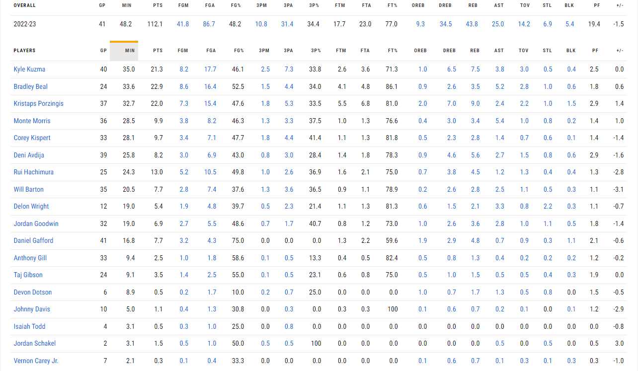 Player Stats through 41 games. Who’s going to stay until our last game this season? by nofuture_at_all Eastern ConferenceSoutheast DivisionWashington Wizards Prev Post Toronto Raptors vs Charlotte Hornets – First Half – 1/10/2023 January 11, 2023 Next Post Silence everybody, Mamba docet 📖 January 11, 2023 1 Comment TheseFkingWeebs 3 years ago Gill Write A CommentYou must be logged in to post a comment.