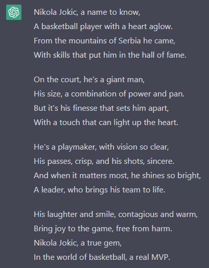 A ChatGPT poem about Nikola Jokic… by Proper_Maximum5739 Denver NuggetsNorthwest DivisionWestern Conference Prev Post How Kyrie TRADE AFFECTS Rockets' Draft Picks! | ESPN Houston February 6, 2023 Next Post ANOTHER Black HS Basketball Player Racially Abused By Bigoted Fans February 6, 2023 9 Comments IdRatherBeLurking 3 years ago I have no clue what people’s fascination with this stuff is. entyfresh 3 years ago On one hand this is great but on the other hand it doesn’t mention horses anywhere, so I’ve gotta go 4/10 (also power and pan?) ile888 3 years ago AI stupid as hell. Look map of Serbia, near Sombor. Flat as PANCAKE. Dydono_ 3 years ago And Pan spirax919 3 years ago AI is gonna take over the world Boyz2sh_t 3 years ago I know I’m older than most of you guys and don’t understand a lot of the new stuff, but I don’t know what Allen Iverson has to do with poetry. MongoPushr 3 years ago Just happy it didn’t mention Nantucket jivecap 3 years ago How do I get “Power and Pan” flair? SongYoungbae 3 years ago I’m sitting here on the toilet, teary eyed after reading thatWrite A CommentYou must be logged in to post a comment.