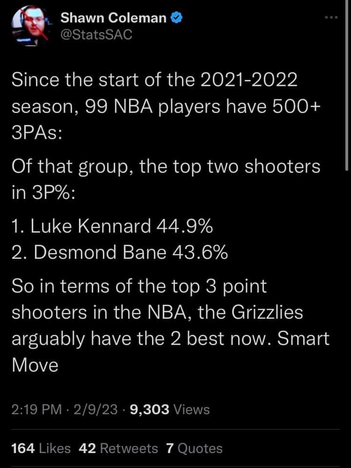 Well at least people can’t say we don’t have any shooting by BetleyIsland36 Memphis GrizzliesSouthwest DivisionWestern Conference Prev Post [Twitter] Mike Conley’s thank you letter February 9, 2023 Next Post 2023 NBA Mock Draft 4.0!! Orlando Magic Future NBA Dynasty?? February 10, 2023 8 Comments DirtyPlayerSuperfan 3 years ago Now jenk just needs to fine-tune the half court Xs and Os KIMJONGUNderfed 3 years ago I’m digging this pick. 2106au 3 years ago People will be shocked by how much the spacing will help Ja and Jaren. AleroRatking 3 years ago Sure. The issue is that kennard can’t do anything else. He is like Duncan Robinson. Can’t keep him in the floor walk_theplanck 3 years ago classical kleiman masterclass mothman26 3 years ago Hopefully Dillon realizes now he doesn’t need to shoot 10+ times a game for us to have a chance. Just play defense and move the ball Waffleshuriken 3 years ago Also shoots 87% career (and is 19/20 attempts this season) from free throw line which i mean hey we need that lmao DrBigChicken 3 years ago Arguably have the two best 3 point shooters in the nba… for this to be how I learned Steph died is… tough. I’ll go mourn now Write A CommentYou must be logged in to post a comment.