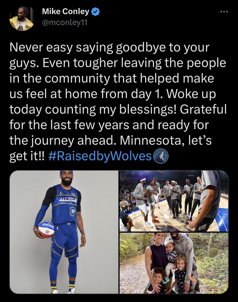 Thank you for everything, Mike Conley by KennyDoge0114 Northwest DivisionUtah JazzWestern Conference Prev Post Jon K opening up a little about Dlo on Dan Barreiro February 9, 2023 Next Post Well at least people can’t say we don’t have any shooting February 9, 2023 10 Comments KennyDoge0114 3 years ago This trade is low key hitting harder than the Mitchell and Gobert trades Source: [here](https://twitter.com/mconley11/status/1623791435404447744?s=20&t=3soJXKM1wtEtSAOm1Fp4Hg) MountainPK 3 years ago 😭 doppido 3 years ago Sucks man. He’s a dude who actually enjoyed being here RiPPn9 3 years ago Great guy and mentor for our young guys. He’ll be missed for sure. Maybe he’ll spend his post NBA career in Utah. Potterhead-PottHead 3 years ago Freakin’ Heckin’ goshin’ I’m so flippin’ sad Elkbowy 3 years ago This trade hurts more then any other trade, not satisfied with the return AND it feels like the end of a era Weepiestbobcat 3 years ago I’m not crying you are! Thunder-ten-tronckh 3 years ago So glad to see y’all had love for him. Know you didn’t technically get prime Conley but he really had his moments the past few seasons. emulator01 3 years ago Once a jazzman always a jazzman thank you mountain Mike! GilgameDistance 3 years ago Goddamnit. Write A CommentYou must be logged in to post a comment.