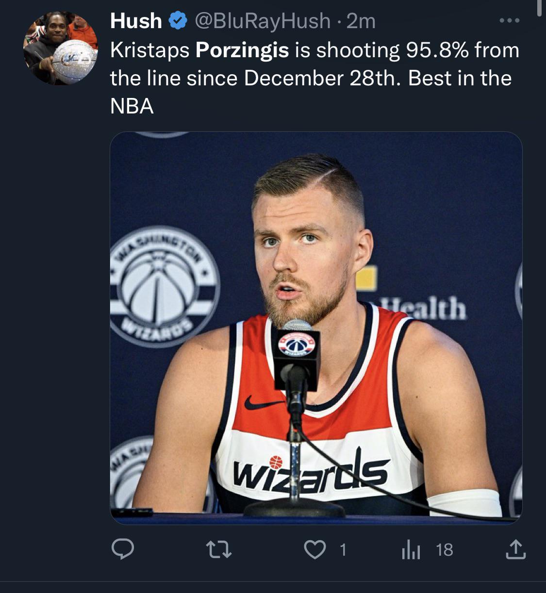 KP leading the league in FT% for 2023 by Hacktivist690 Eastern ConferenceSoutheast DivisionWashington Wizards Prev Post Sacramento Kings vs. Phoenix Suns Full Game Highlights | Feb 14 | 2022-2023 NBA Season February 15, 2023 Next Post Boston Celtics vs. Milwaukee Bucks Full Game Highlights | Feb 14 | 2022-2023 NBA Season February 15, 2023 9 Comments QUESTOTHETOP1 3 years ago That’s my unicorn! onigami_los 3 years ago Latvian KD is here! esm_z 3 years ago Damn I love KP! Jellybeansmw 3 years ago And he started season by shooting 70% for no damn reason 😀 CoachDennisGreen 3 years ago So why does Beal shoot the technicals?? broadwayallday 3 years ago *muffled Shaq horse sound* naughtyboy35 3 years ago What happened? He used to be inconsistent with his FTs. thayil 3 years ago isn’t gafford leading the league in FG%, too? z3mcs 3 years ago The great thing about this is KP is so good at drawing fouls. SO GOOD. Write A CommentYou must be logged in to post a comment.