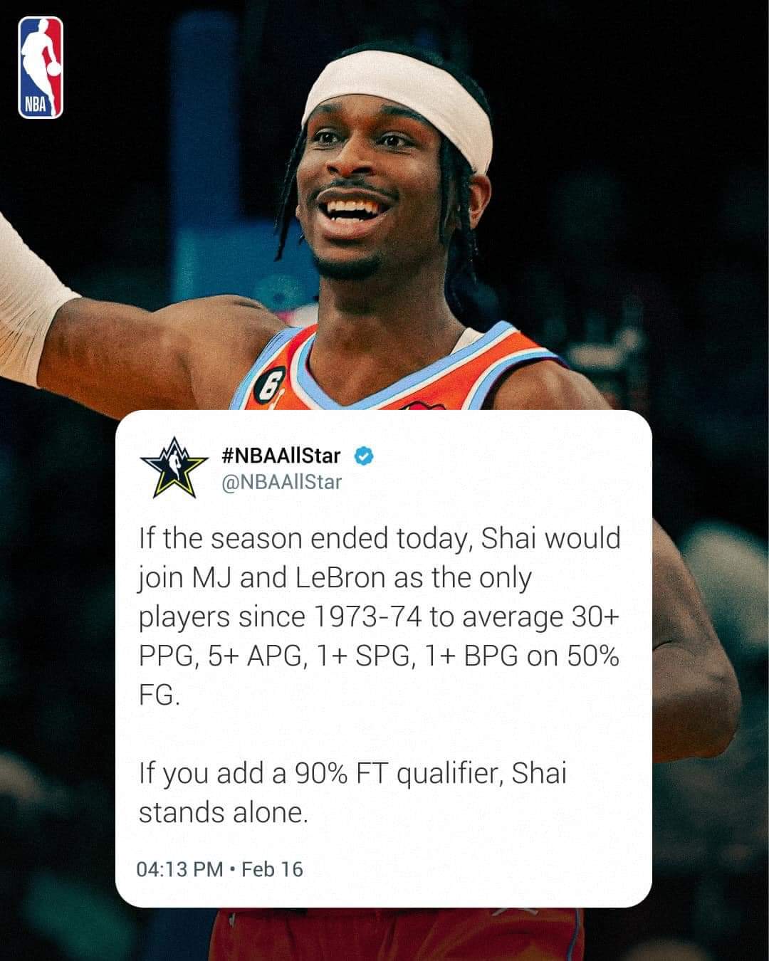 See… this! I love the stats that come out of sports. I am an Aussie who jumped on the Thunder train because of the Giddey Kiddie. SGA is a great talent having a superstar year, but seeing a stat line like this puts it into the right perspective…. any sentence that he is a part of that starts with “only with MJ and Lebron” is amazing… ending it with “he stands alone” is just cold AF.