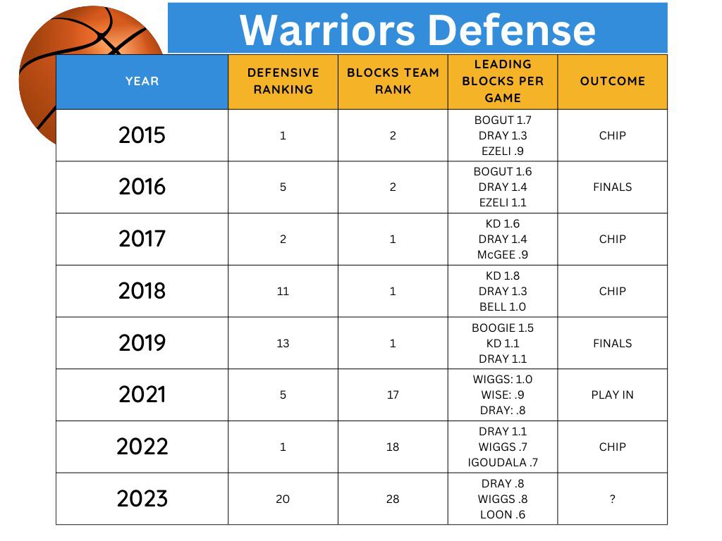 Last year was interesting in that GSW had a #1 defensive rating even though their team block rate was down at 18. In addition to blocks, defensive rating takes steals and defensive rebounds into account and GSW excelled in those areas ranked #4 in steals and #2 in defensive rebounds.