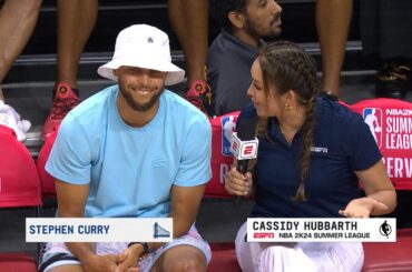 Cassidy Hubbarth interviews Steph Curry during the Warriors’ Summer League game against the Pelicans about Golden State trading for Chris…