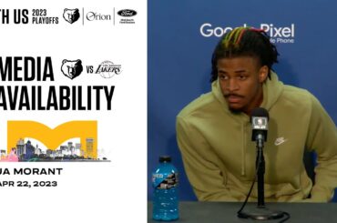 Memphis Grizzlies guard Ja Morant speaks with media after loss to the Lakers in Game 3. Morant finished with 45…
