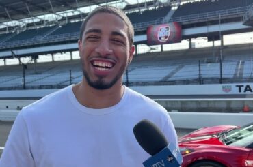 Indiana Pacers guard Tyrese Haliburton talks at Indianapolis Motor Speedway after turning laps in the Chevy Corvette Z06 pace car…