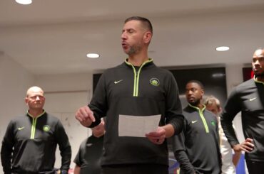 New Orleans Pelicans associate head coach James Borrego talks to the team postgame in the Pelicans locker room after their…