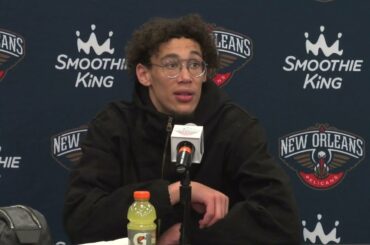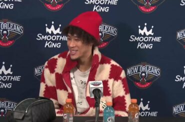 New Orleans Pelicans center/forward Jaxson Hayes speaks to the media following the Pelicans win over the Oklahoma City Thunder on…