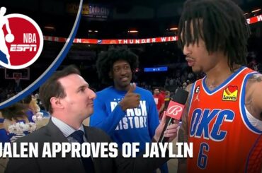 During Jaylin Williams’ post-game interview after the Oklahoma City Thunder’s blowout win against the Houston Rockets, teammate Jalen Williams is…