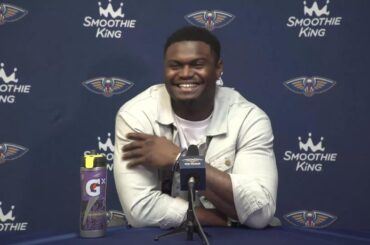 New Orleans Pelicans forward Zion Williamson speaks to the media following the team’s win over the New York Knicks on…