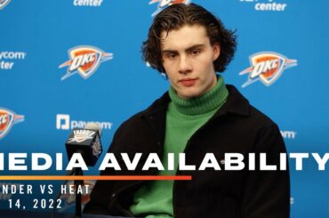 Mark Daigneault, Josh Giddey, Lu Dort and Shai Gilgeous-Alexander speak with the media following the Thunder’s loss to the Miami…