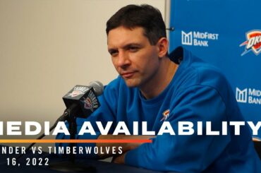 Mark Daigneault, Eugene Omoruyi, and Shai Gilgeous-Alexander speak with the media following the Thunder’s loss to the Minnesota Timberwolves on…