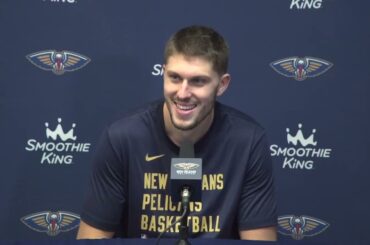 New Orleans Pelicans forward Matt Ryan speaks to the media following the team’s win over the Detroit Pistons on Thursday,…