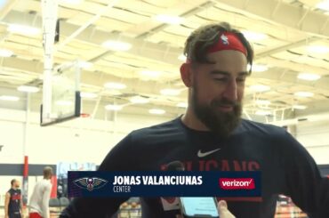 New Orleans Pelicans center Jonas Valanciunas speaks with the media following shootaround practice ahead of the Pelicans’ game against the…