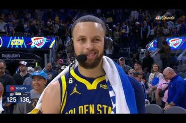 Stephen Curry fields questions following the Golden State Warriors’ 136-125 win over the Oklahoma City Thunder, a game in which…