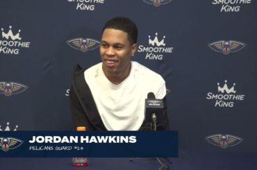 New Orleans Pelicans guard Jordan Hawkins talks about the team’s loss to the Golden State Warriors on October 23, 2023.…